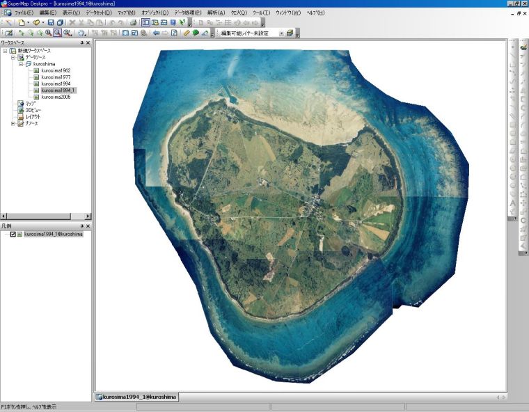 画像処理を施したkuro1994i.tifは,位置情報を持っていないので,新たに位置情報を設定しますが,kuro1994i.tifを作成する元になったデータセットkuroshima1994_2の位置情報をコピーする処理となります。この時,桁数の大きなデータをコピーしますので,アクセサリのメモ帳を利用すると間違いを起こしません。 @ワークスペースウィンドウ内のデータセットkuroshima1994_2を右クリック/属性より以下のウィンドウが開きます。範囲の上下左右の値をコピー&ペーストでメモ帳にコピーします。作業後,このウィンドウは閉じます。 ![]() ![]() Aワークスペースウィンドウ内のデータセットkuro1994iを右クリック/属性より以下のウィンドウが開きますメモ帳にコピーしたデータを,範囲の上下左右にコピー&ペーストでコピーします。作業後,このウィンドウは閉じます。 ![]() 以上で,データセットkuro1994iとkuroshima1994_2は完全に重なることとなります。準備完了。 ![]() ![]() |