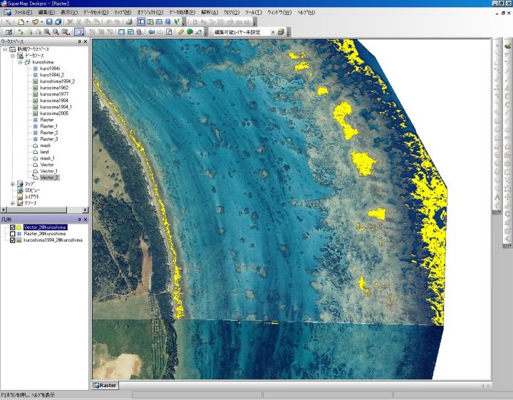 空中写真はジオリファレンス(レジスタ処理)にて、位置座標を設定後モザイクイメージを作成したとして解説します。それぞれの処理したいデータに読み替えて説明を読んでください。 1.不要部分削除と解像度再設定 (1)不要部分削除 データセット1994画像を開き,メニューより,マップ/マップグリップ/ポリゴンを使って,海(サンゴ礁礁斜面外側)や空中写真の外枠(黒い部分)を削除する。