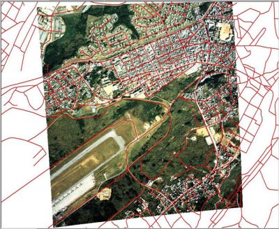 『一次近似』処理空中写真と参照レイヤーに利用した道路地図の重ね合わせ