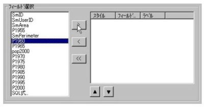 Bフィールド選択。統計グラフ作成に利用するフィールドを属性フィールド一覧より複数選択する。必要なフィールド名を右側の一覧より選択,>ボタンにより左側一覧表に移動。必要なフィールド数だけこの操作を繰り返す。<ボタン操作により選択を解除可能。また,左側一覧表内の各スタイル,ダブルクリックよりスタイル変更可能。変更方法はポリゴンスタイル設定と同様。