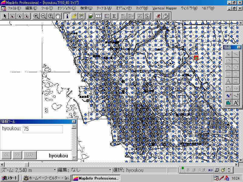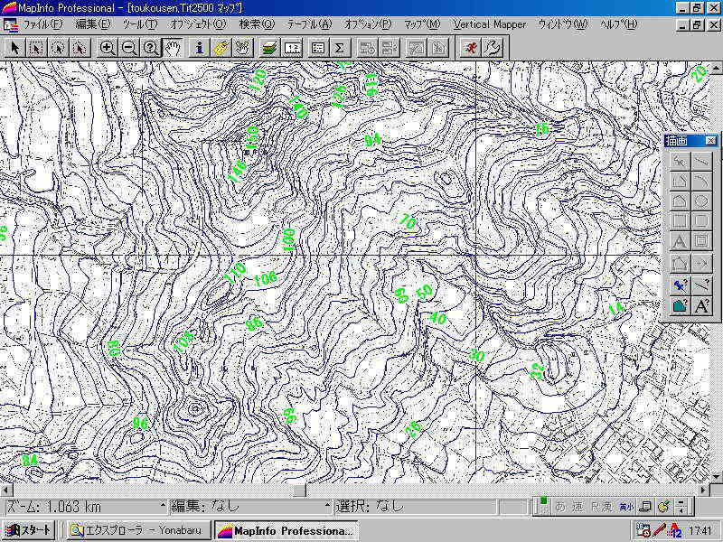 このデータを基にして,地形を3D表示するためのグッリドデータ(メッシュデータ)などを生成する。この作業はVeritical MapperというMapInfoのアドオンソフトを使った処理となるので,マニュアルを参照してほしい。